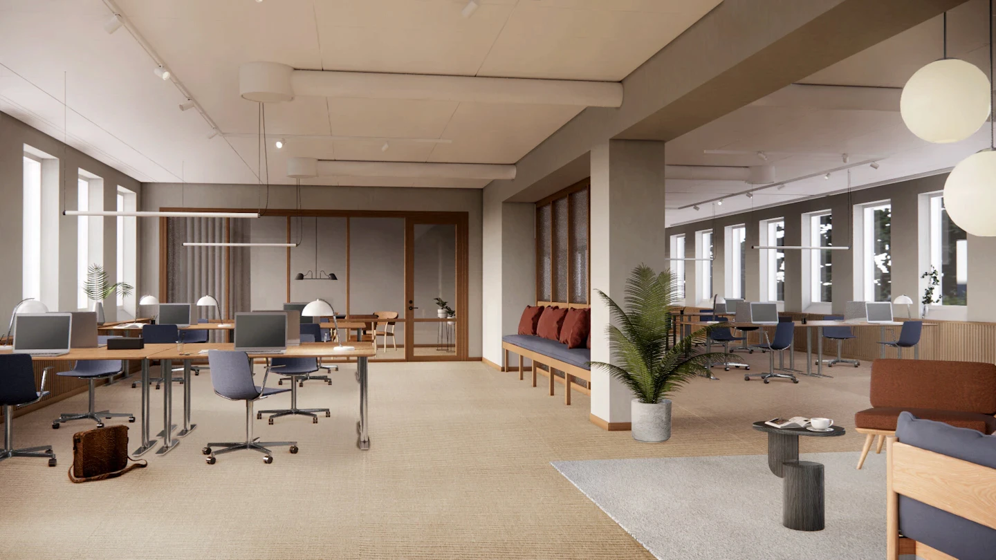 Vi samarbetar med arkitekter och använder teknik som konkurrerar med nyproduktion för att göra inomhusklimatet till modern standard. Många och stora fönster samt högt läge skapar rymd och ljus. Mellan husen finns en lummig och grön innergård med gott om plats för att ta pauser eller äta lunch. Vi kommer att rusta upp och förnya entréerna och fastigheten i stort (se visualiseringar ovan).